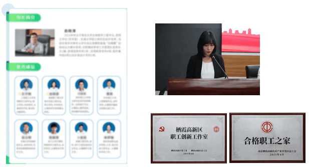 左圖:創(chuàng)新工作室簡(jiǎn)介,右上:陳圓圓代表公司工會(huì)發(fā)言