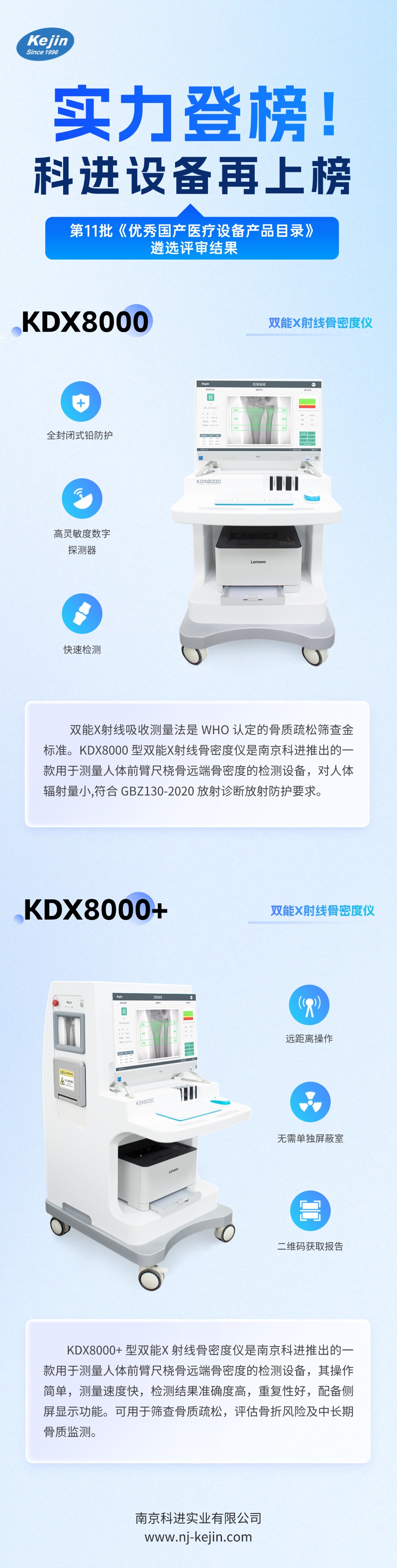 2025年9月16日,由中國醫(yī)學(xué)裝備協(xié)會組織的第十一批《優(yōu)秀國產(chǎn)醫(yī)療設(shè)備產(chǎn)品目錄》遴選評審工作已完成,評審結(jié)果開放公示。由南京科進(jìn)實(shí)業(yè)有限公司自主研發(fā)生產(chǎn)的雙能X射線骨密度儀KDX8000、KDX8000+成功入選!